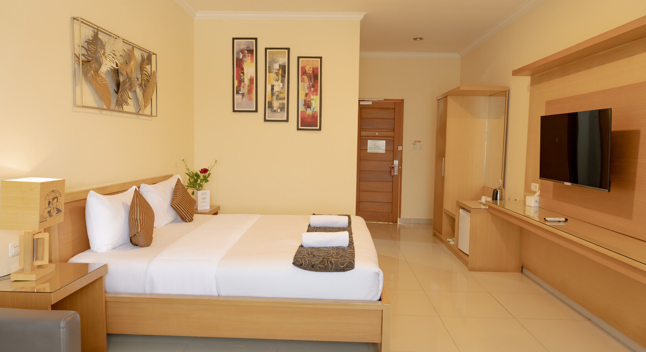 Deluxe Room dirancang bagi tamu yang menginginkan lebih banyak ruang dan kenyamanan. Dengan tempat tidur premium, meja kerja, dan fasilitas modern seperti TV layar datar dan Wi-Fi gratis, kamar ini cocok untuk pelancong bisnis maupun liburan. Interior hangat dan tata ruang yang efisien menciptakan atmosfer santai dan menyenangkan selama masa menginap Anda